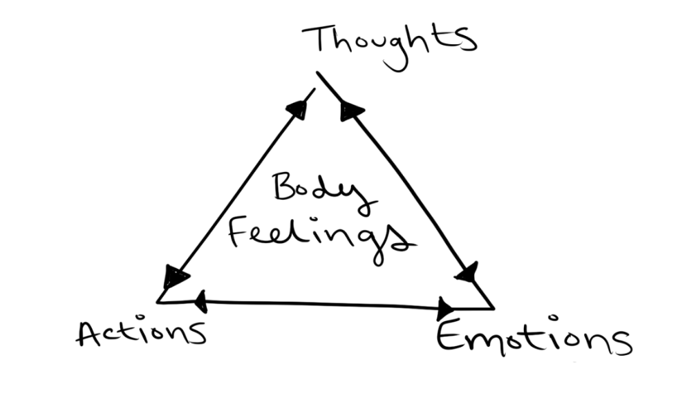 So, the arrows indicate the interrelatedness of the parts. How you think affects what you do and how you feel, how you feel affects what you’re thinking about and what you do, etc. You get it. And in the middle of all of this is how your body feels. Are you feeling tired? Hungry? Energetic? Cold, nauseated, sick? These are all body feelings. But why start with these?