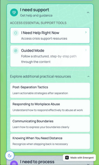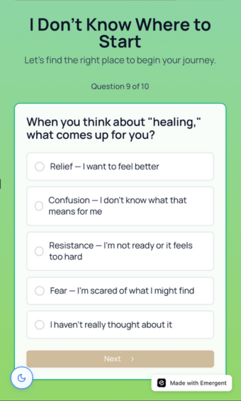 - Guided self-reflection and quizzes to help users identify areas of distress and need