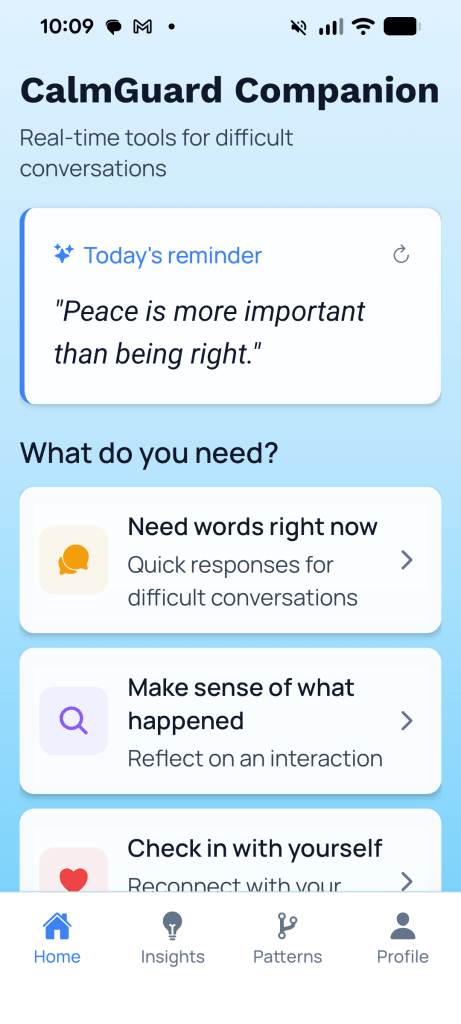 CalmGuard Companion is designed for moments when conversations feel confusing, tense, or emotionally draining. It provides quick scripts, grounding tools, and short reflection exercises to help you slow down, regain clarity, and respond thoughtfully.
